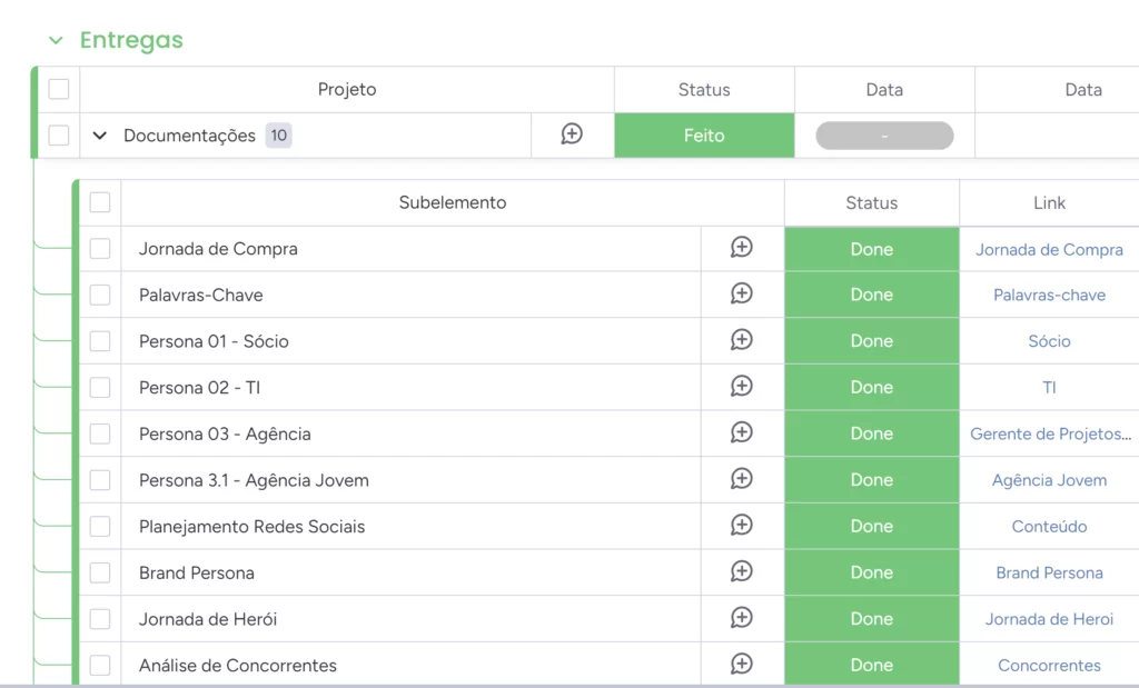 Para ficar mais visual e fácil para o cliente acompanhar, também transformamos esse mapa mental em uma sequência de tarefas com prazo de entrega:
